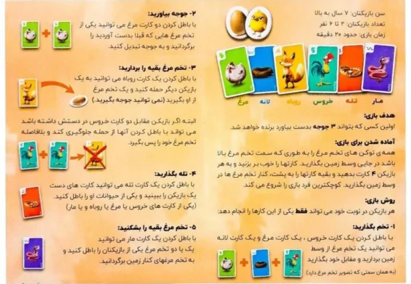 بازی فکری مرغ دونی یک بازی کارتی جذاب و هیجانانگیز برای تمام اعضای خانواده است. در این بازی، بازیکنان با کارتهایی شامل مرغ، خروس، لانه، تخممرغ و کارتهای خطرناکی مانند روباه، مار و تله سروکار دارند. هدف اصلی بازی، به دست آوردن بیشترین تعداد تخممرغ و تبدیل آنها به جوجه است. اما در مسیر رسیدن به این هدف باید حسابی مراقب روباهها و مارها باشید چون ممکن است همه زحمتهای شما را نقش بر آب کنند! این بازی ترکیبی از شانس، استراتژی و سرعت عمل است که هم خنده و هیجان را به جمعهای خانوادگی و دوستانه میآورد و هم مهارت تصمیمگیری و ریسکپذیری بازیکنان را تقویت میکند.