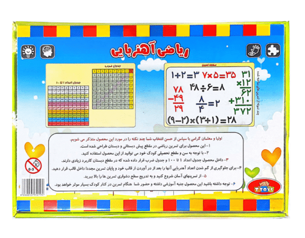 این محصول برای تمرین ریاضی در مقطع دبستانی و پیش دبستانی طراحی شده است که با توجه به سن و مقطع تحصیلی کودک میتوانید از آموزش ریاضی آهنربایی تی تویز استفاده نمایید.داخل محصول جدول اعداد 1 تا 100 و جدول ضرب قرار داده شده که در مقطع دبستان کاربرد زیادی دارند. برای جلوگیری از گم شدن اعداد آهنربایی آنها را بعد از درآوردن از قالب خود و پایان تمرین، مجددا داخل قالب قرار دهید، توصیه می شود از تمرین های آسان شروع و به تدریج سطح دشواری تمرین ها را بالا ببرید.