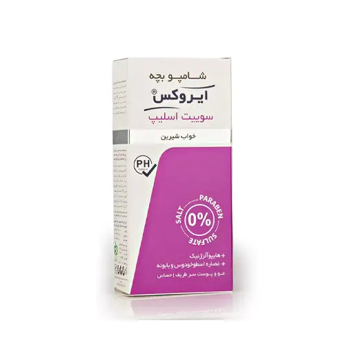| توضیحات | شامپو بچه سوئیت اسلیپ ایروکس شویندهای ملایم برای مو و پوست سر کودک است که PH آن سازگار با پوست کودکان در نظر گرفته شده است. پوست کودکان بسیار لطیف است و شویندهای که به منظور شستشوی پوست آنها به کار برده میشود، اصولا باید فاقد مواد حساسیتزا باشد تا پوست را دچار التهاب و قرمزی نکند. در شامپو بچه ایروکس نیز از مواد شیمیایی حساسیتزا، سولفات، نمک و پارابن استفاده نشده و با خیال راحت میتوان برای کودکان از آن استفاده نمود. این شامپو مخاط چشم را تحریک نمیکند و چشم اطفال را نمیسوزاند. Sweet Sleep به معنای خواب شیرین است و به این دلیل این اسم را روی این شامپو گذاشتهاند که ترکیبات آن موجب آرامش کودکان میشود. عصاره اسطوخودوس و عصاره بابونه از جمله ترکیبات گیاهی موجود در این شامپو هستند.