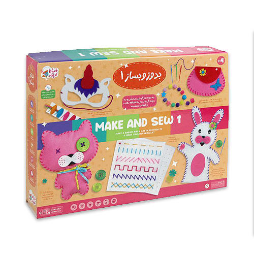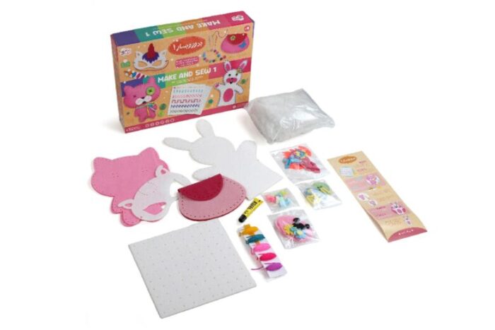 این مجموعه شامل قطعات نمد رنگی از پیش برشخورده، نخ و سوزن پلاستیکی ایمن، الیاف پرکننده و تزئیناتی مانند دکمه، روبان و مهره است. کودک با استفاده از الگوهای راهنما، قطعات نمدی را میدوزد، داخل آن را پر میکند و با تزئینات رنگی، عروسک یا کیف نمدی زیبایی میسازد.